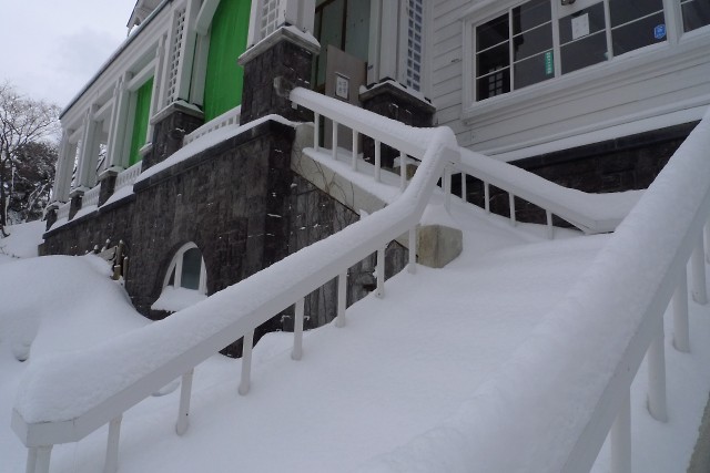 雪の和光荘は久しぶりです。木々も階段も池も雪の中でした。